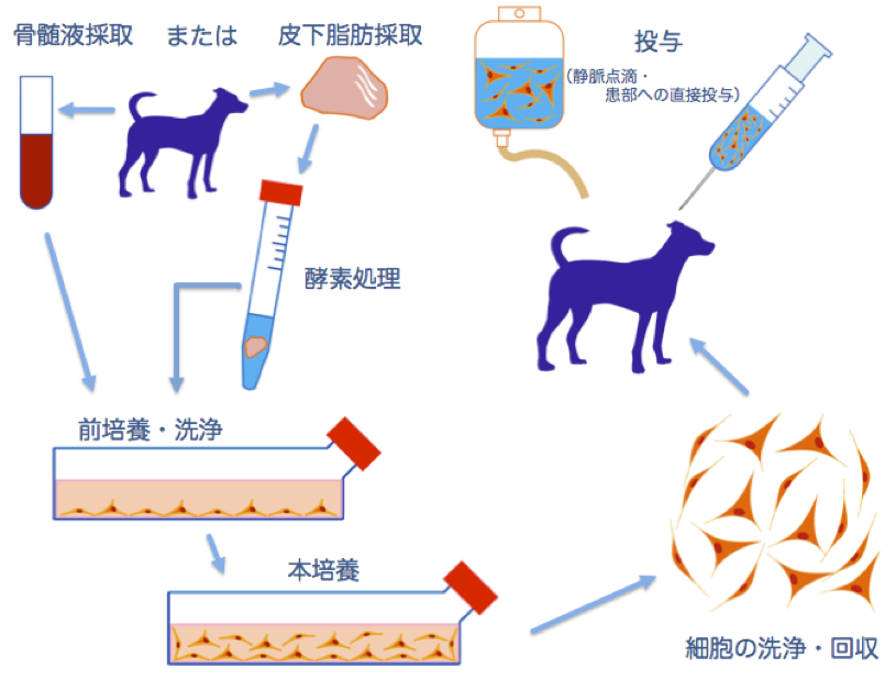 A 病気のわんちゃんやネコちゃんから脂肪組織や骨髄液を少しだけとり、そこから増殖させた幹細胞を用いて、ダメージを受けた患者の細胞や組織を修復したり再生したりする治療方法を指します。その際用いる幹細胞は、血液中に投与される場合もありますし、あるいは患部に直接移植される場合もあります。