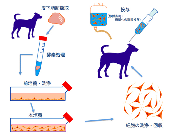 イヌ、ネコの血液(10-12mlを採血)からリンパ球を回収し、薬剤を加えてリンパ球(αβTリンパ球)の活性化・増殖を行ないます。その後、およそ1,000倍に増えたリンパ球を洗浄・回収し、点滴で体内に戻します。